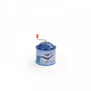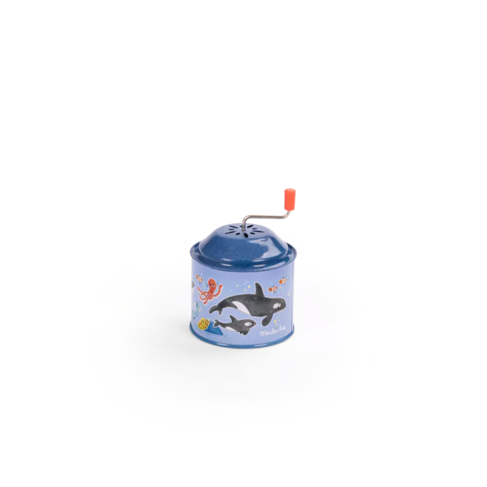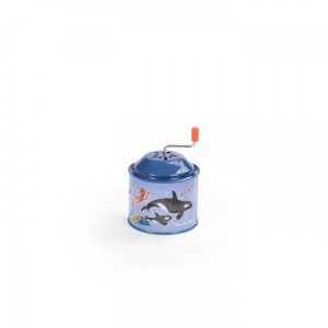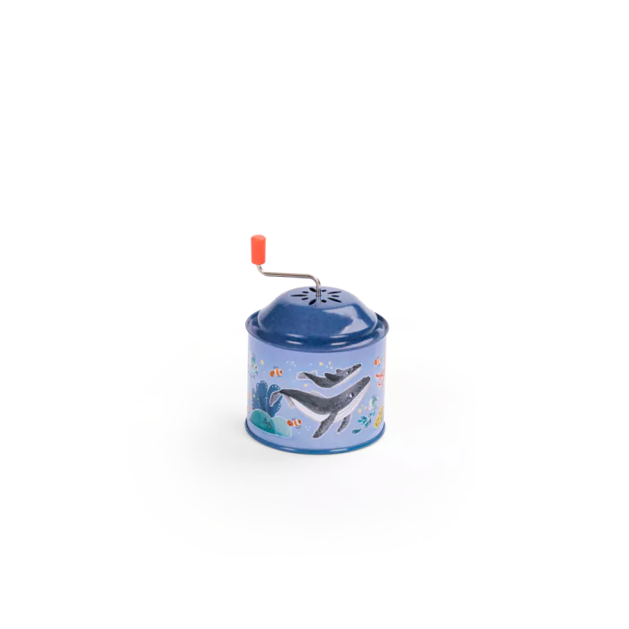 Tourne, tourne et en avant la musique ! Clin d’œil aux jouets qui ont accompagné notre enfance, le moulin à musique en métal coloré met en scène les amis de Paulie explorant les fonds marins.